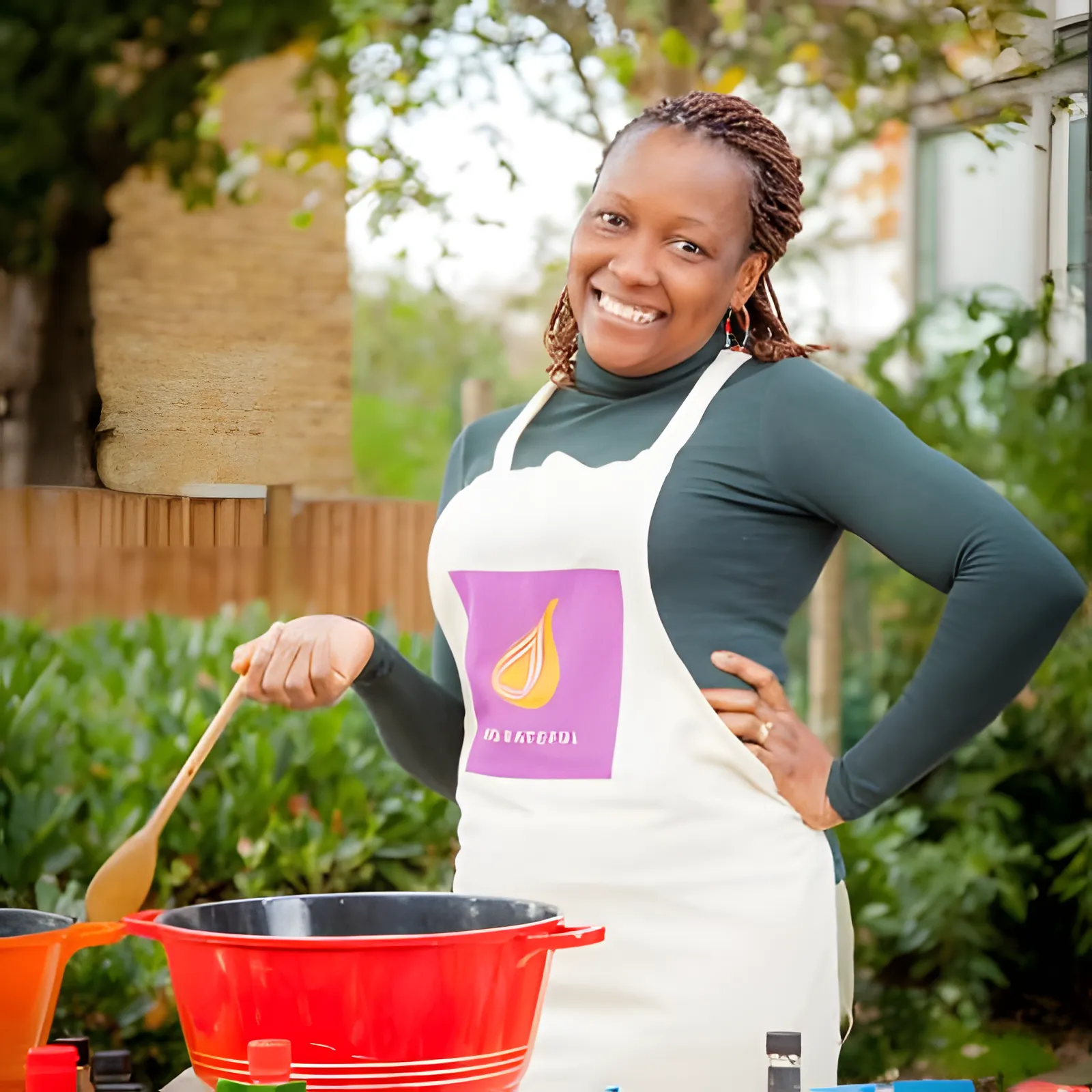 A woman smiles while sitting at a table in a Migrateful London Cookery Class in a garden.